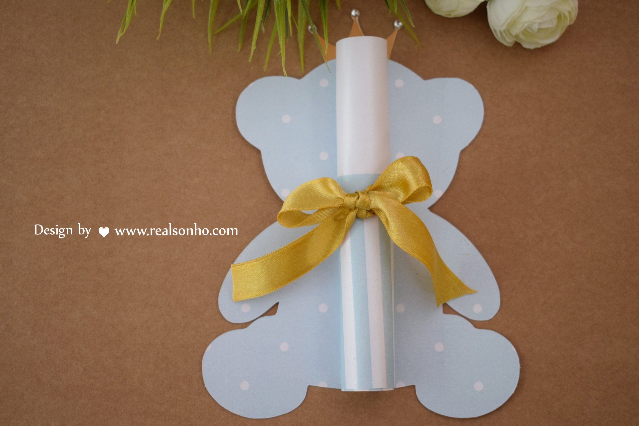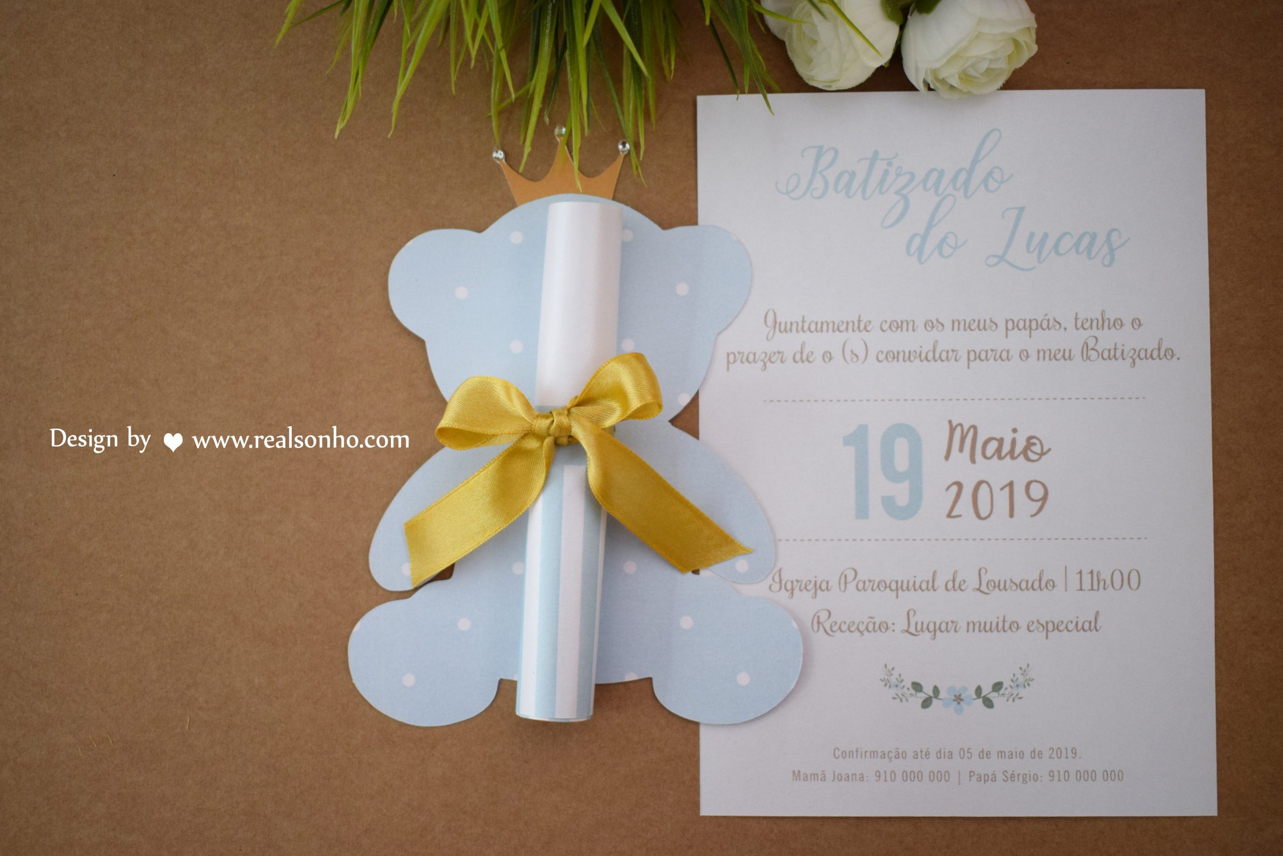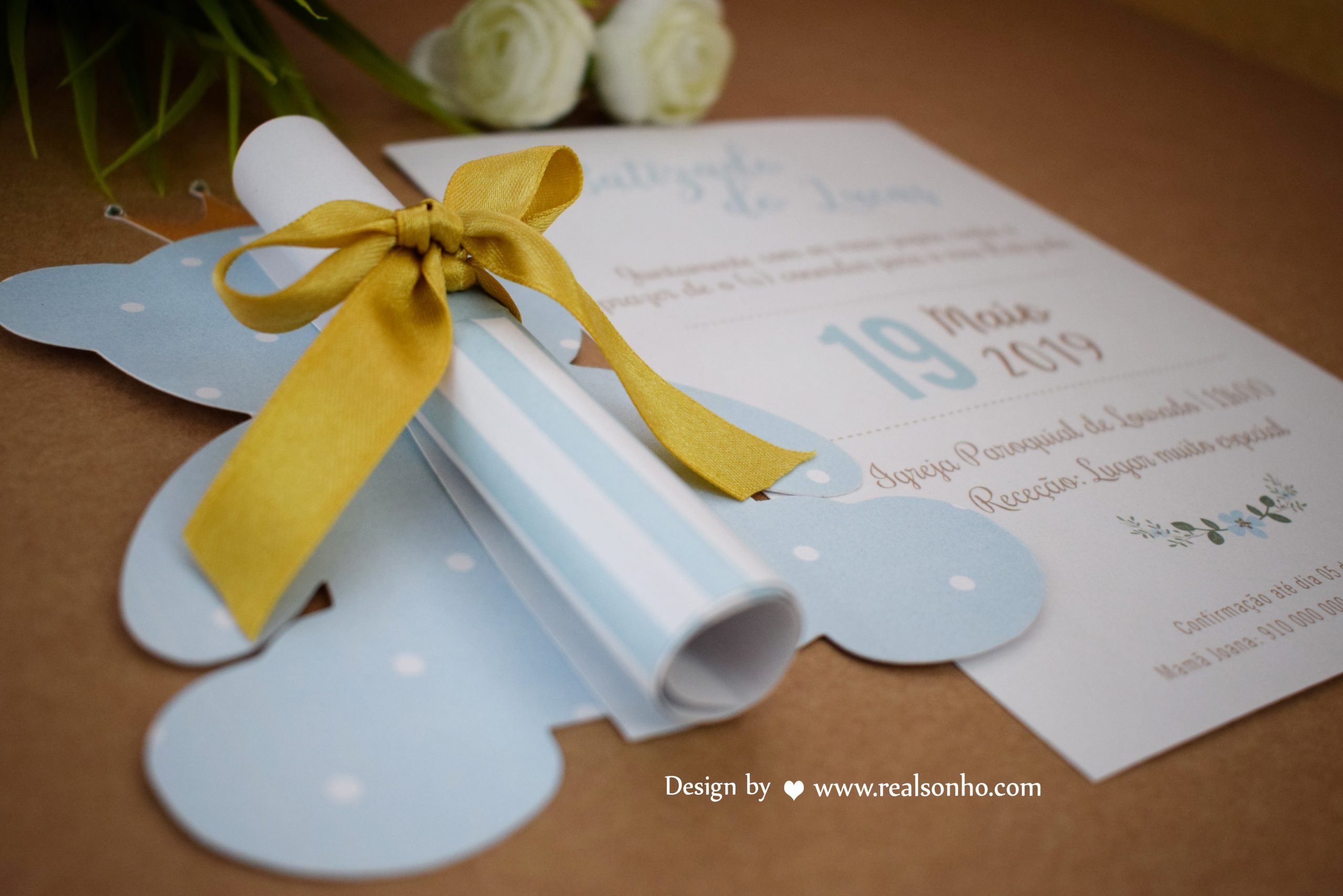 Dimensões: 17×13 cm (ursinho); 14,5 x 21 cm (convite)