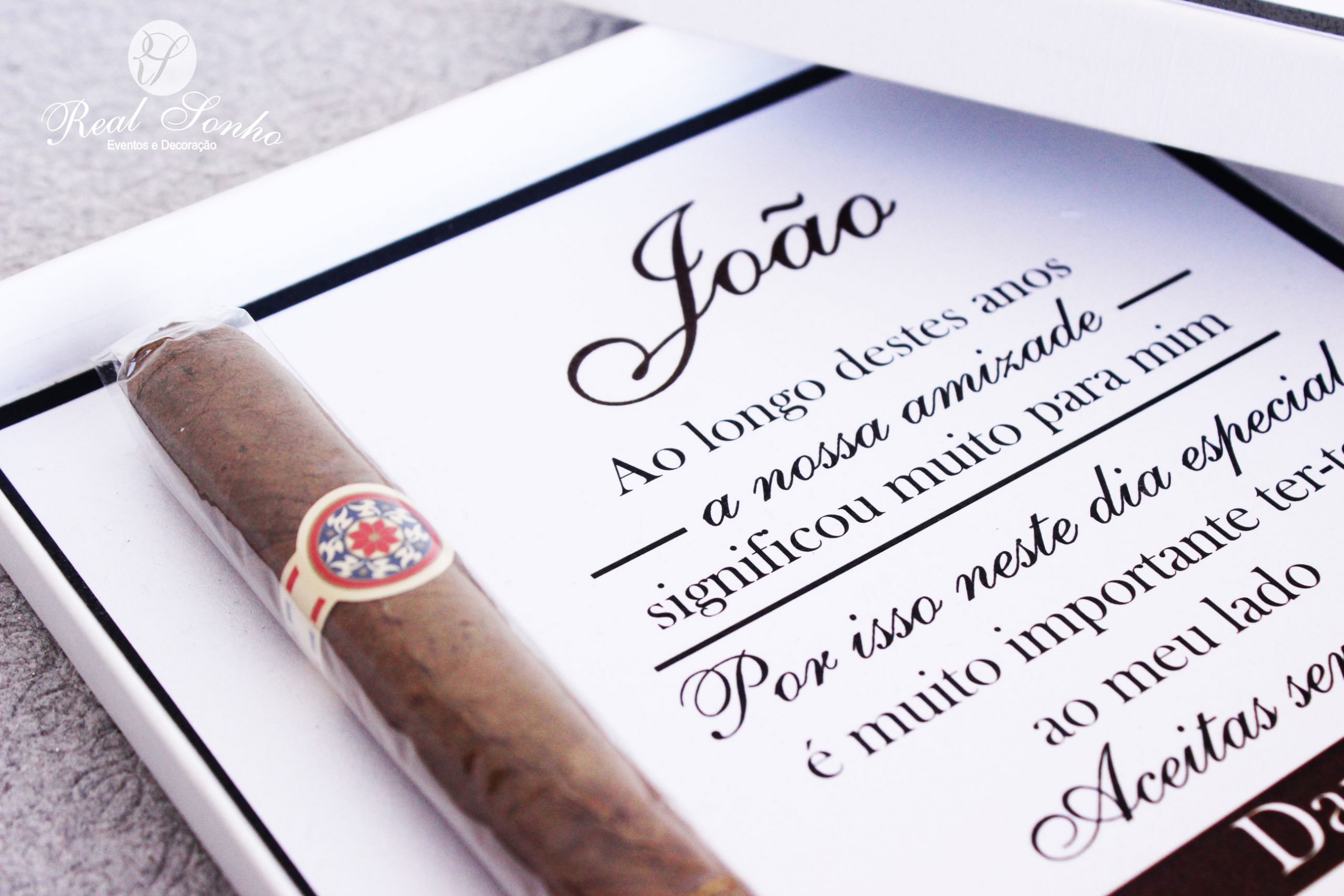 Descrição do interior: O interior é apresentado com o texto a convidar e charuto