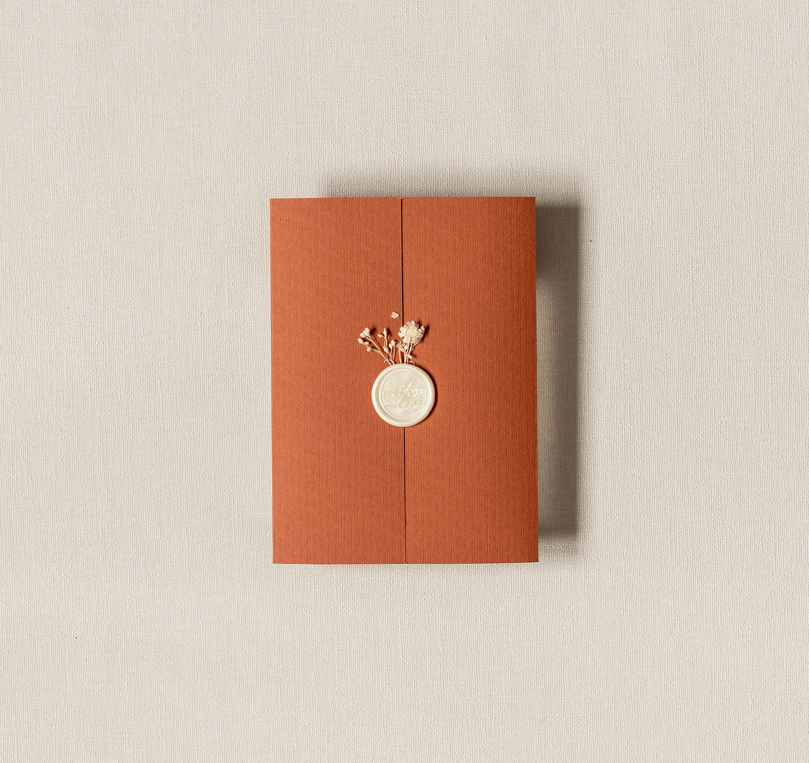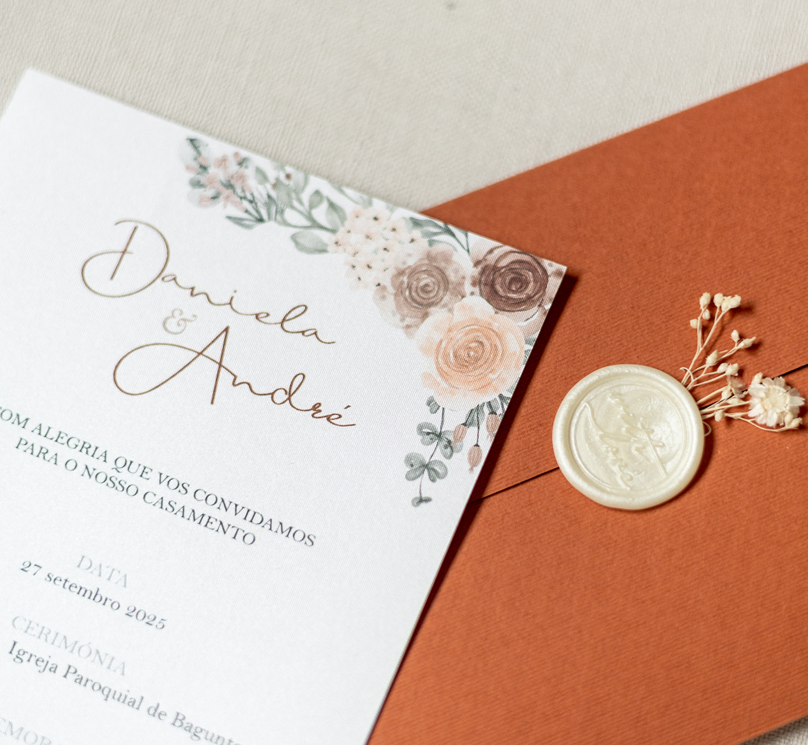 Convite de casamento terracota com lacre branco e design floral delicado. Um modelo elegante e minimalista para celebrações únicas.
