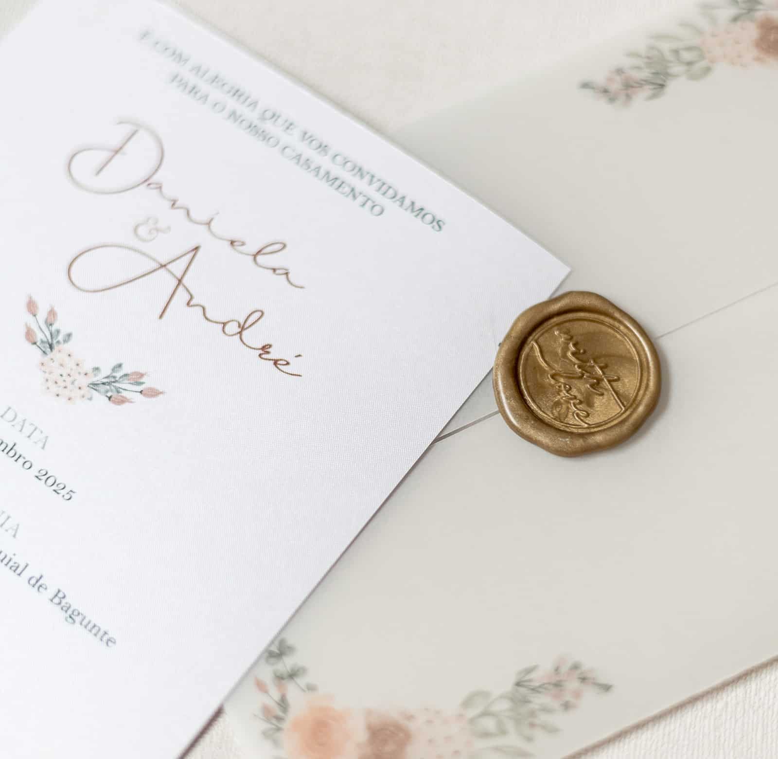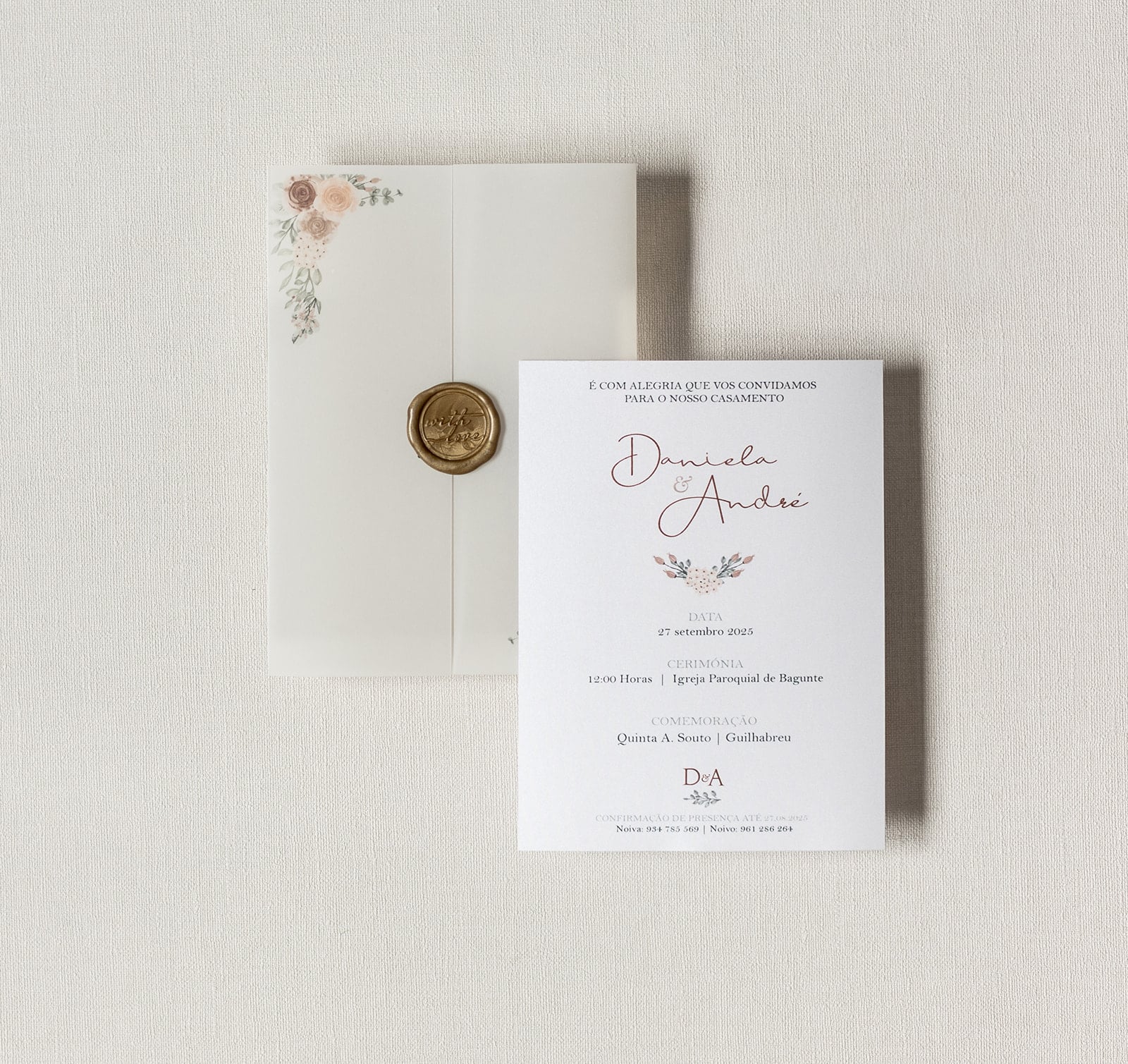 Convite de casamento com envelope translúcido e flores em tons terracota. Um design romântico e elegante, perfeito para casamentos intemporais.