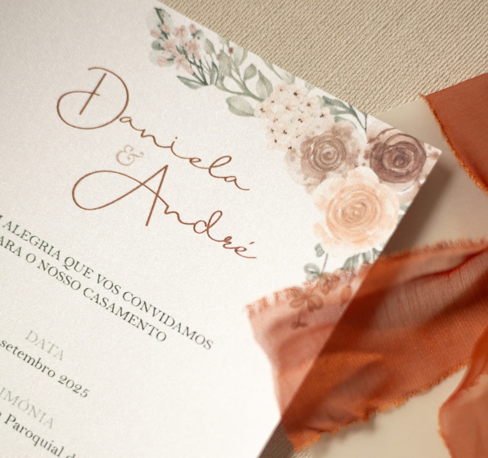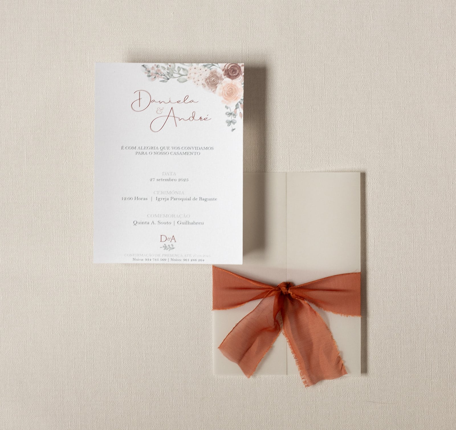Este convite de casamento terracota é a combinação perfeita entre o rústico e o sofisticado. O envelope translúcido, envolvido por uma fita de corte manual em tom quente, cria uma harmonia natural e elegante, ideal para casamentos  de inspiração boho. Cada detalhe reflete cuidado e autenticidade, resultando num design intemporal e acolhedor. Produzido com materiais de qualidade e totalmente personalizável, este convite é a escolha ideal para casais que procuram um toque de estilo e natureza.