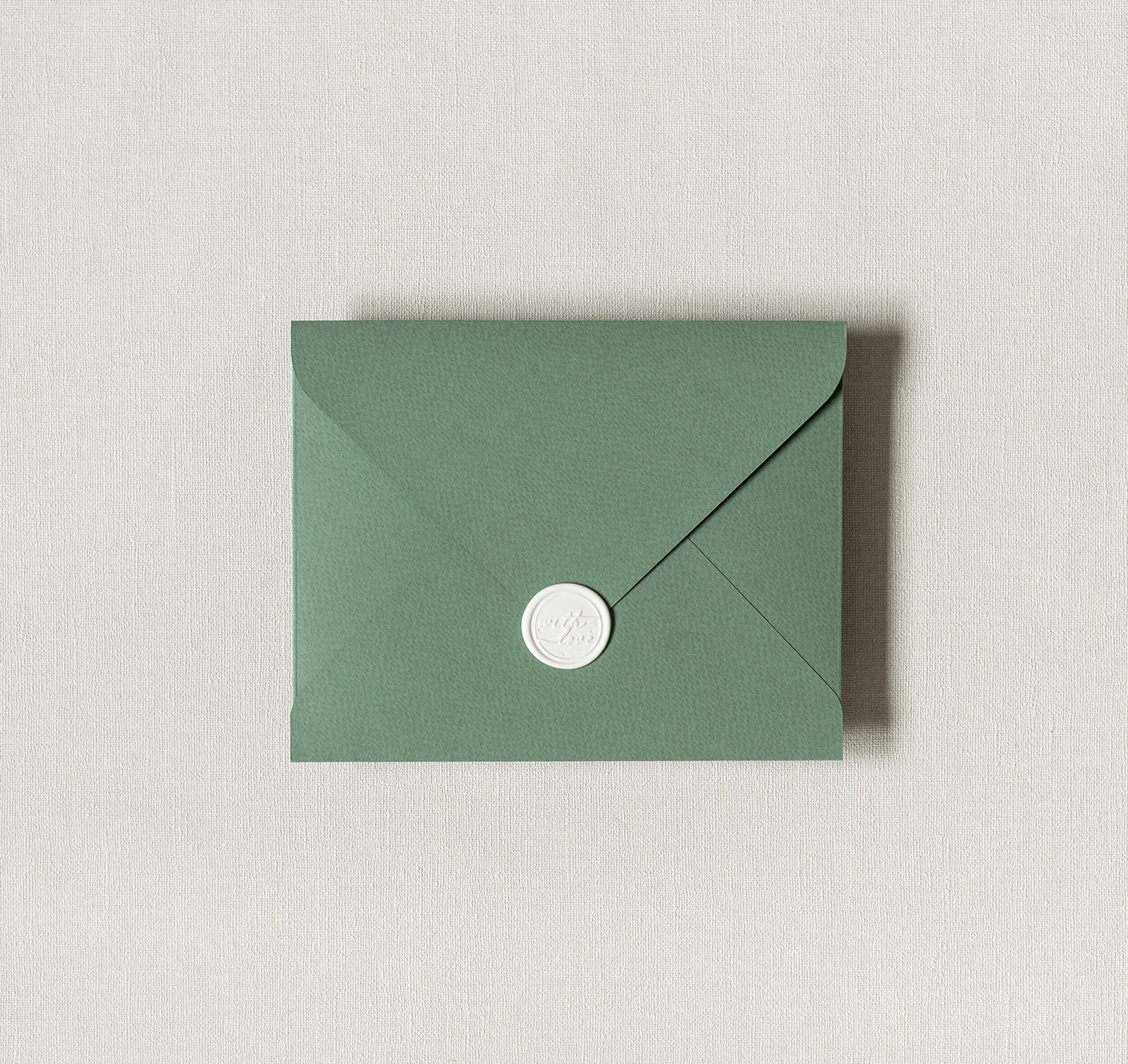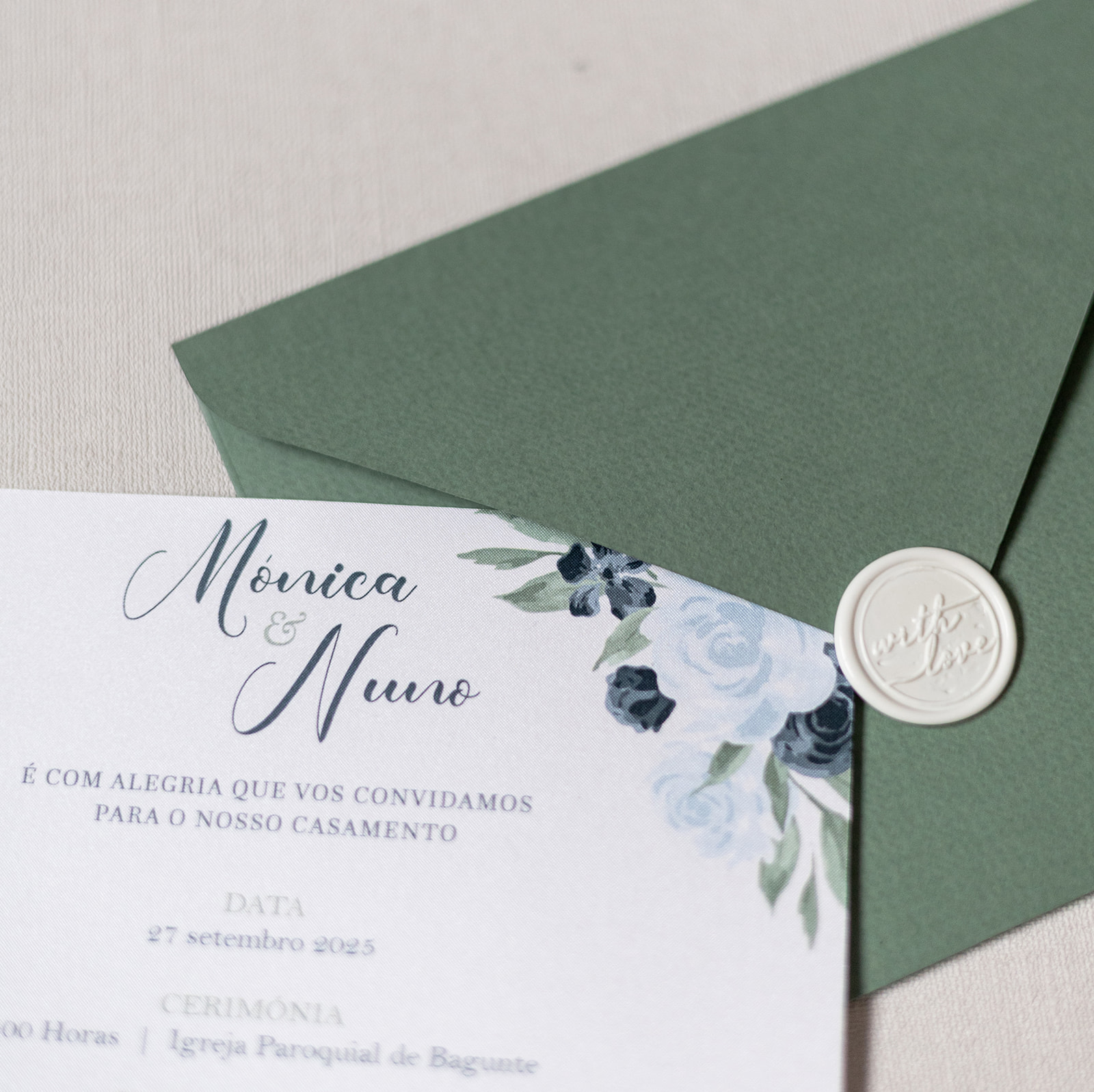 Convite de casamento moderno em verde pastel com lacre elegante. Envelope 15×19 cm, design sofisticado que encantará os seus convidados desde o primeiro olhar.