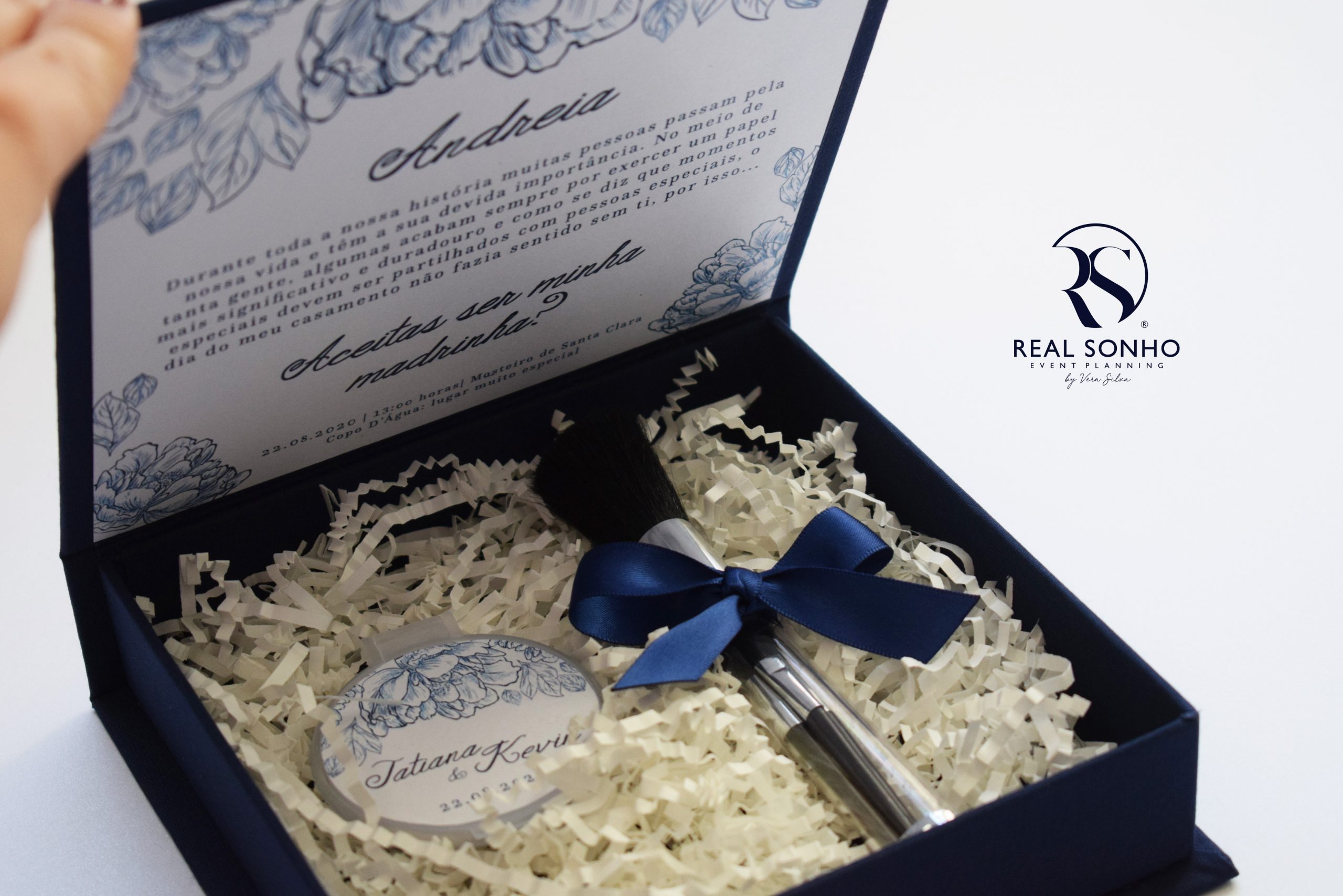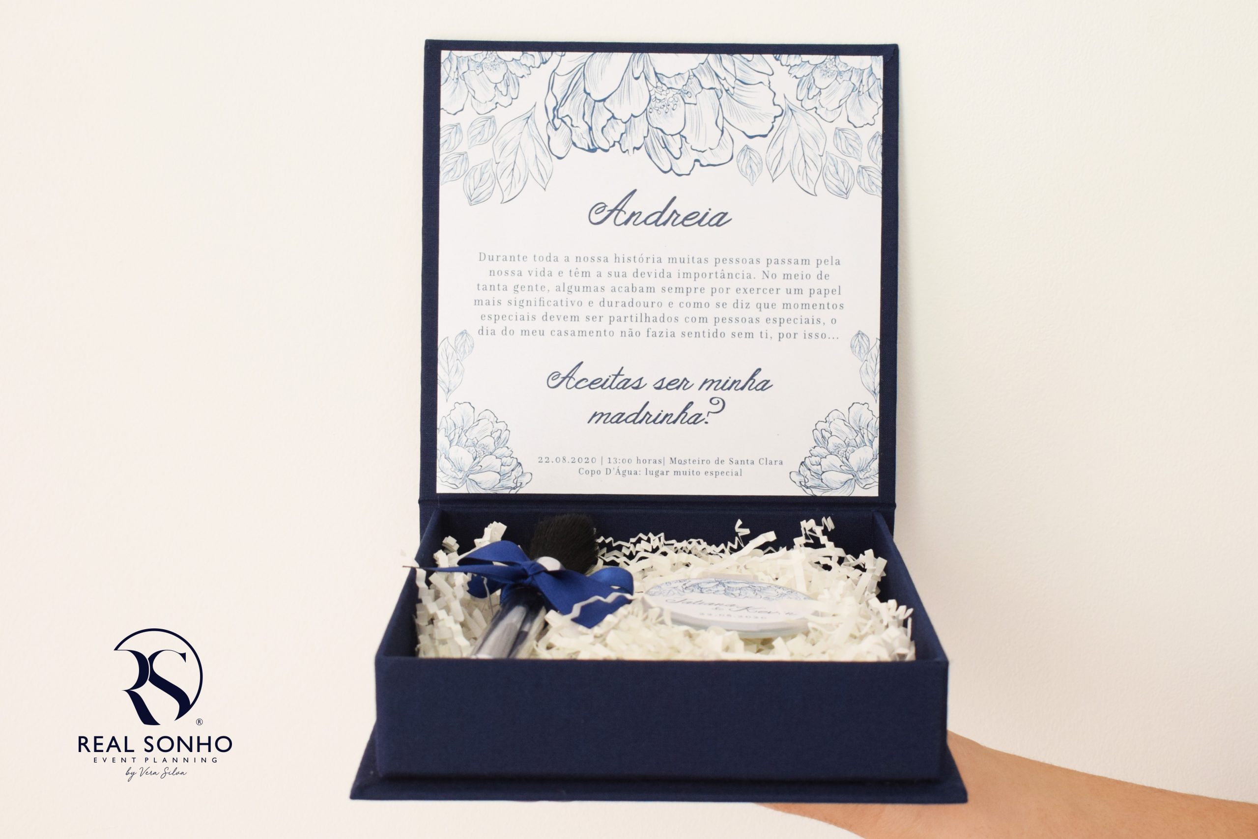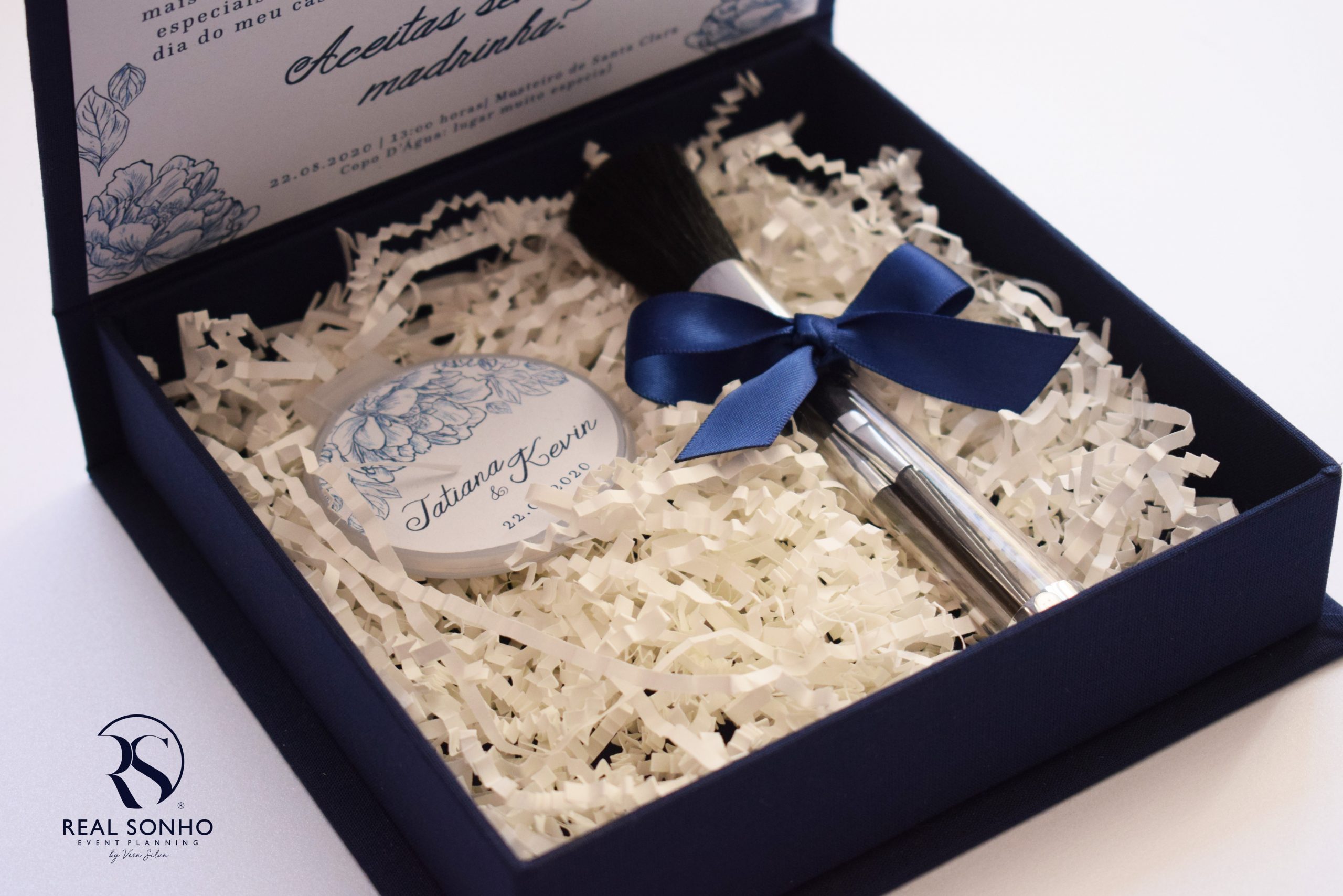 Decoração da caixa: forrada a tecido azul marinho com impressão personalizada no interior ( o convite da imagem está com o design da coleção Navy 2020)