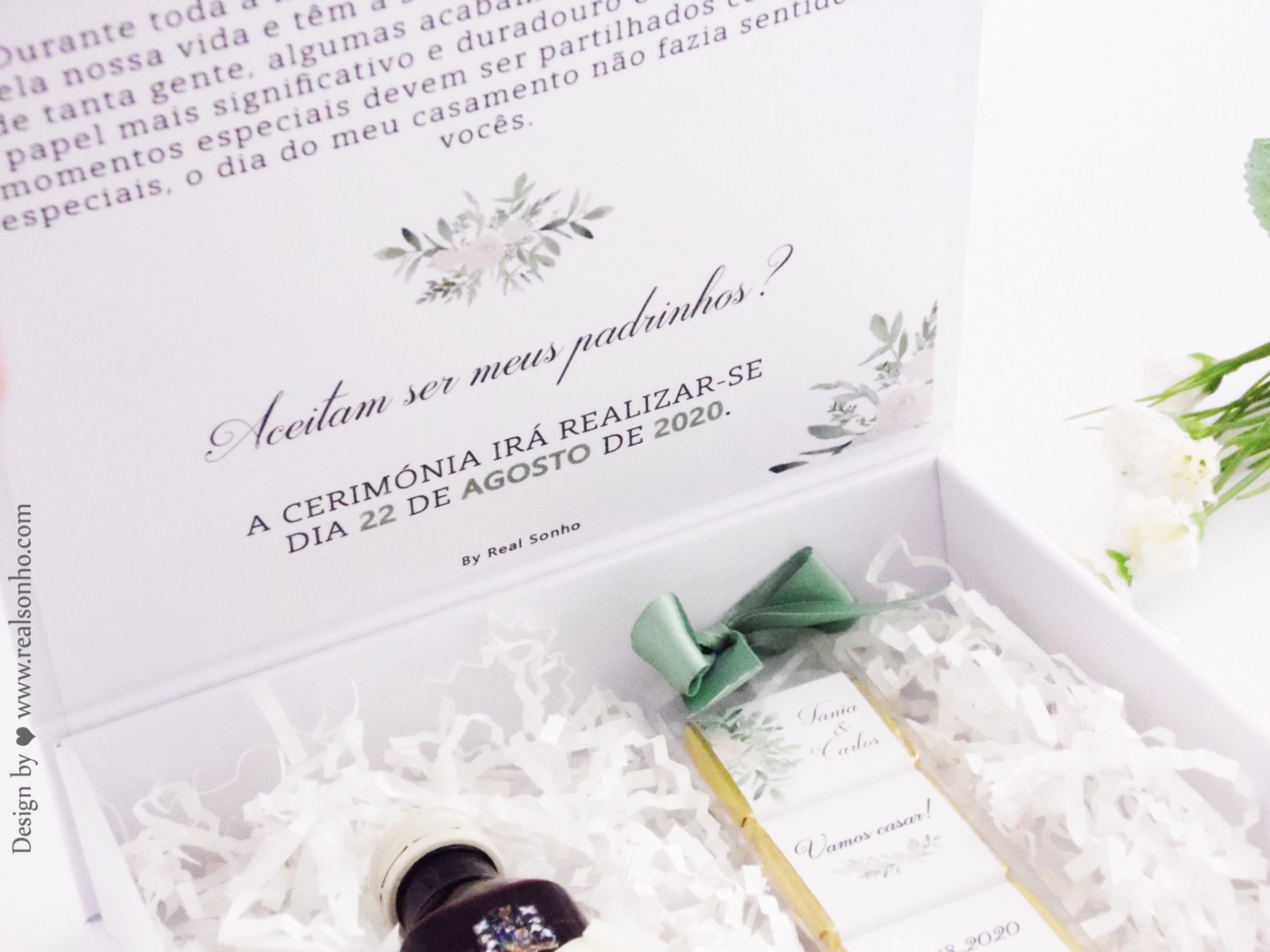 O valor apresentado corresponde à caixa convite personalizada, bebida e caixa com 3 napolitanas de chocolate personalizadas e não com 4 como apresentado na imagem. Assim que nos seja possível a imagem deste convite será substituída.