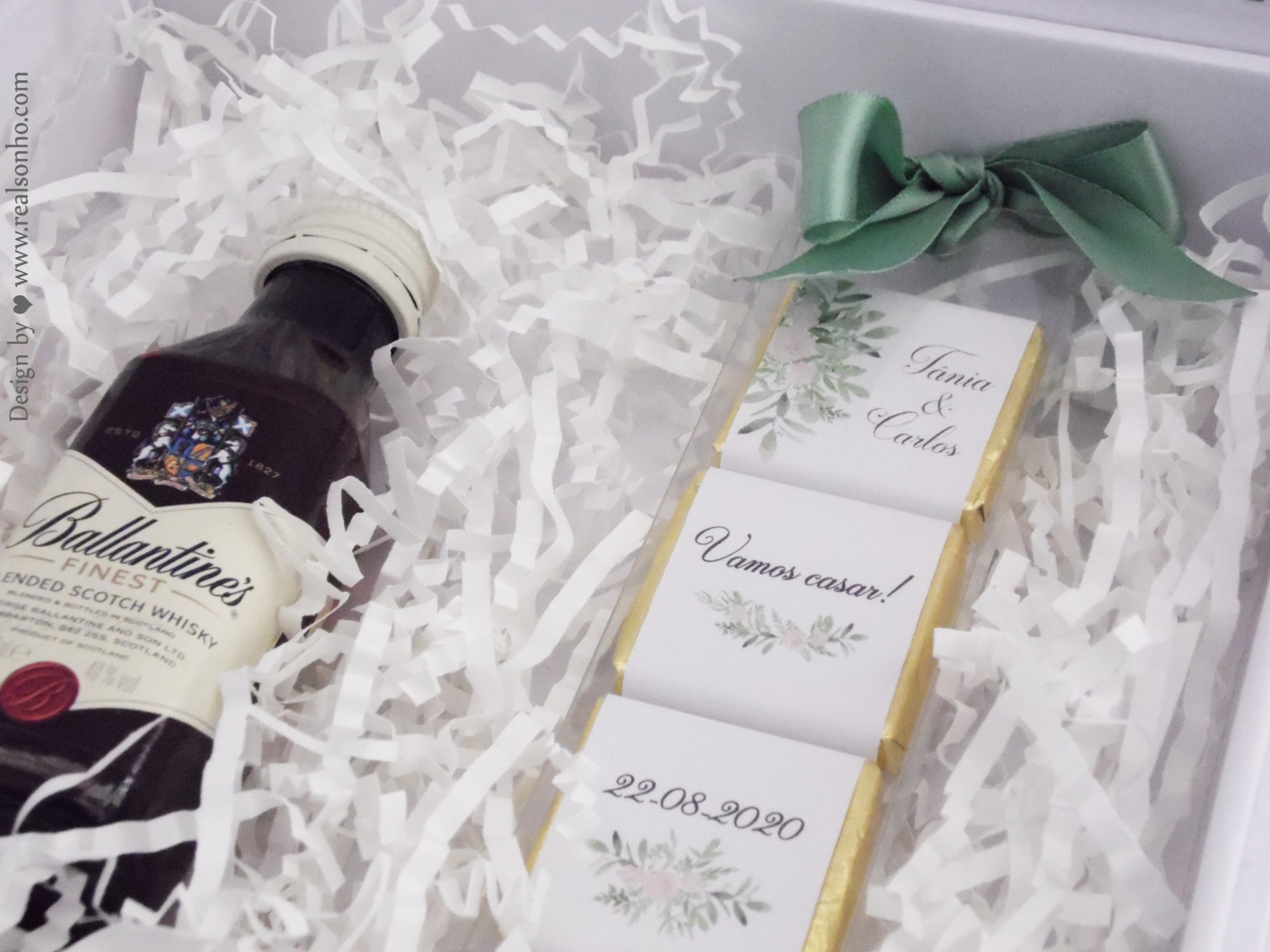 Interior com: mini garrafa whisky ( imagem da marca meramente ilustrativa, poderá ser usada outra marca mediante existência de stock) e napolitanas chocolate personalizadas