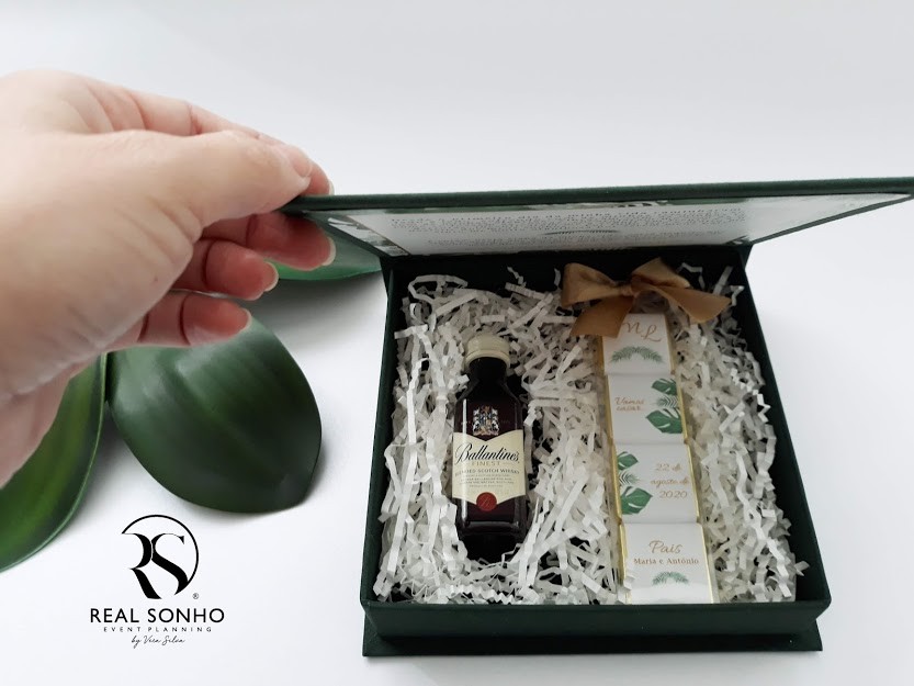 Interior com: mini garrafa whisky ( imagem da marca meramente ilustrativa, poderá ser usada outra marca mediante existência de stock) e napolitanas chocolate personalizadas