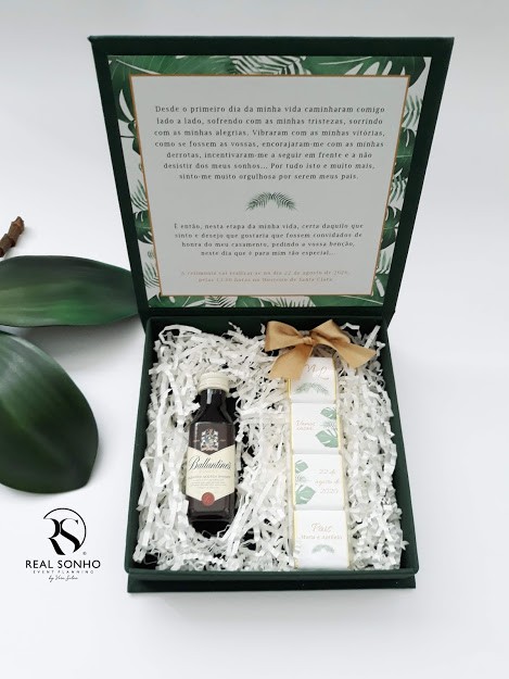 O valor apresentado corresponde à caixa convite personalizada, bebida e caixa com 3 napolitanas de chocolate personalizadas e não com 4 como apresentado na imagem. Assim que nos seja possível a imagem deste convite será substituída.