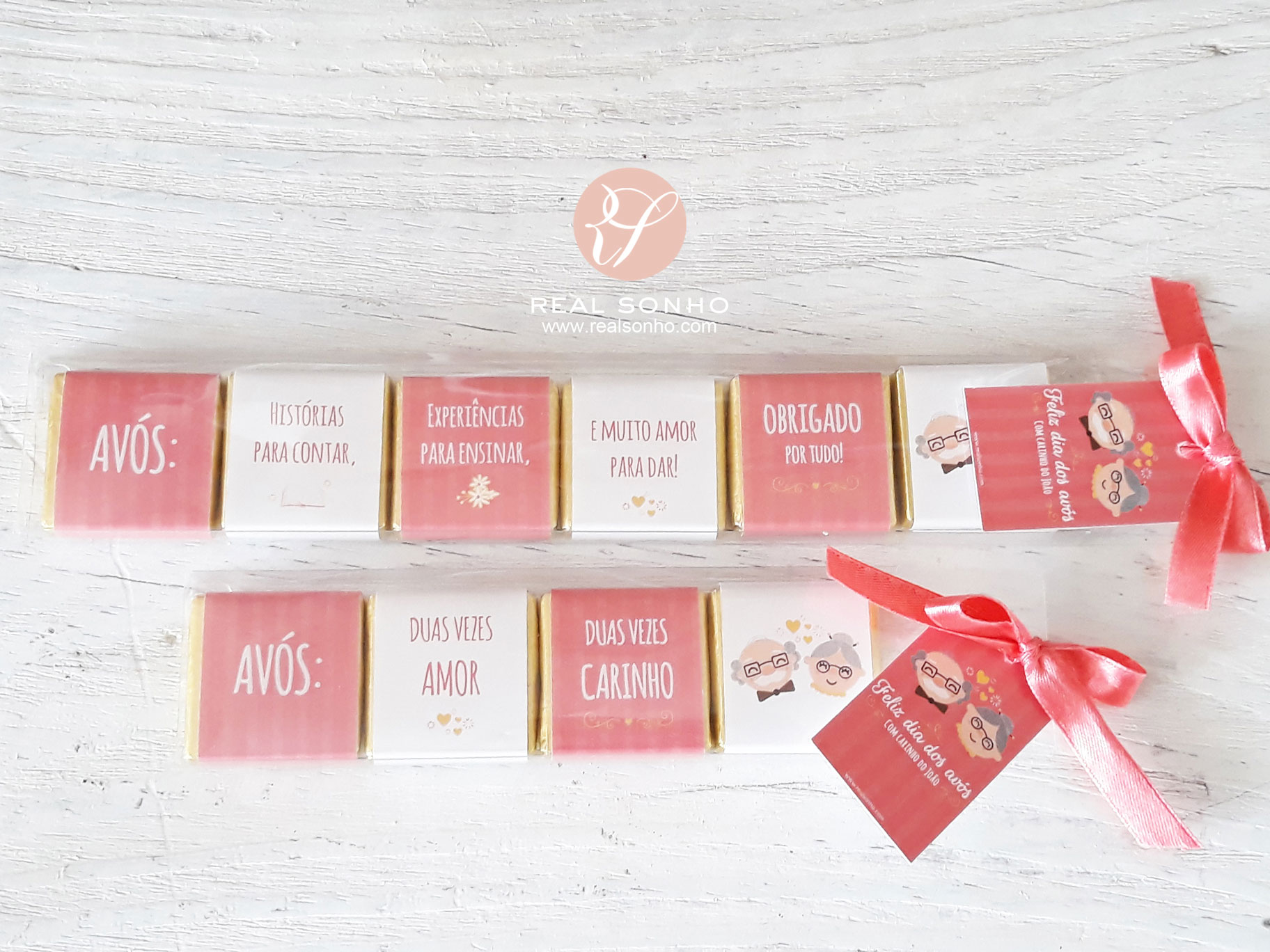 Caixa acrílica com seis napolitanas de chocolate e etiqueta personalizada (com nome do neto ou neta)